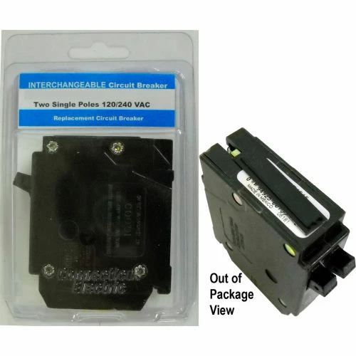 Interchangeable circuit breaker. Mechanically compatable with loadcenters from American Swich, Arrow-Hart, Bryant, Challenger, Cutler-Hammer, Electricenter, Frank Adams, GTE Sylvania, General Switch, General Electric, Gould, Montgomery Ward, Siemens. Murray, Thomas & Betts, Westinghouse. 10,000 AIC. Twin 1-pole, 15A/15A